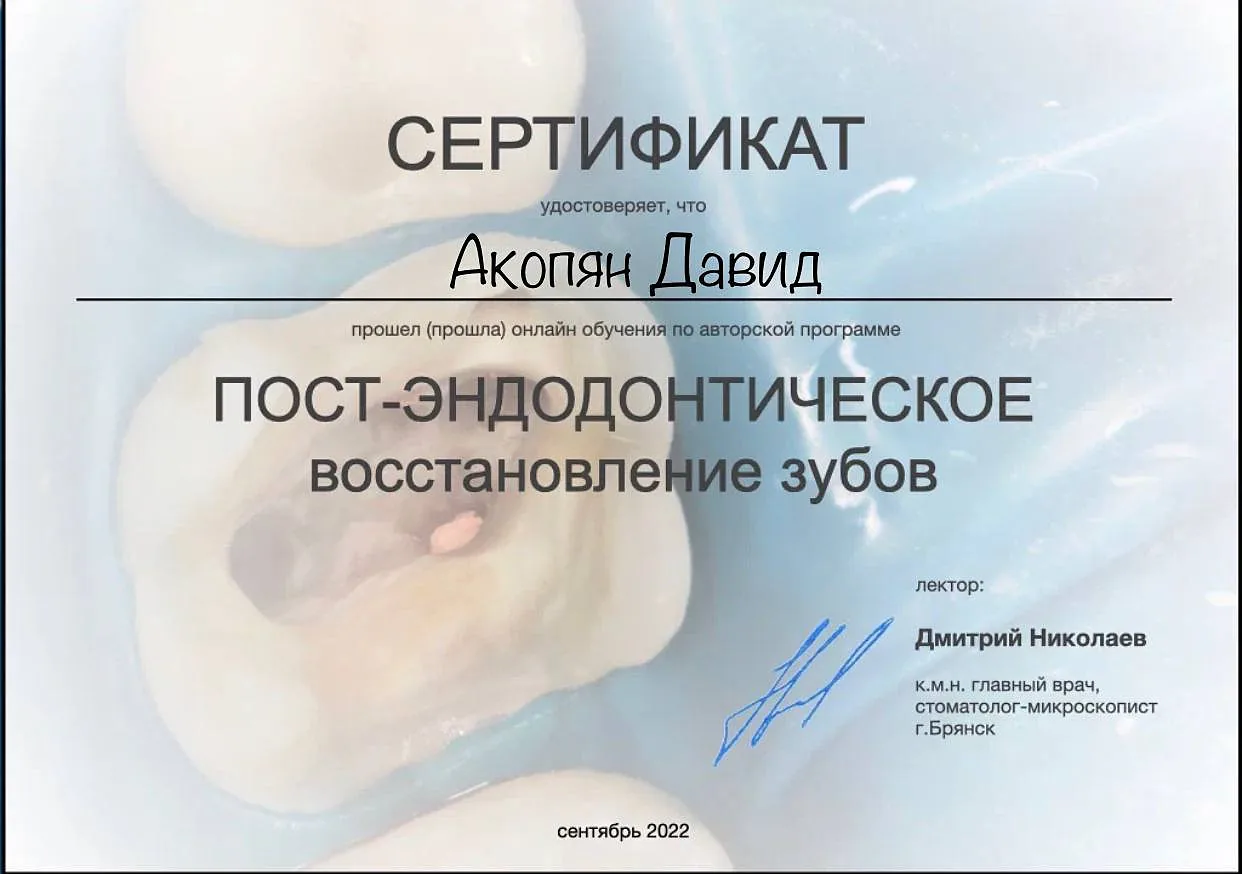 В сентябре 2022 г. прошёл обучение по авторской программе «Постэндодонтическое восстановление зубов» и был сертифицирован.