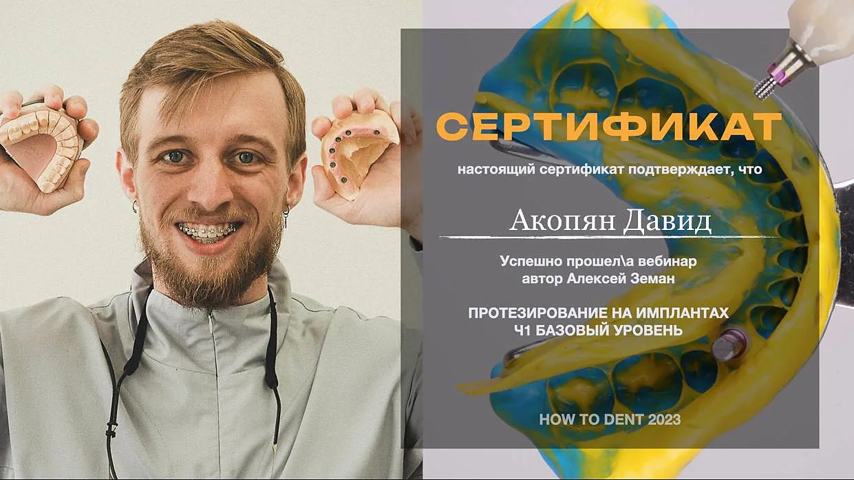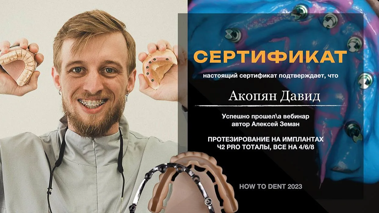 В 2023 г. успешно прошёл вебинар «Точность и эстетика в ортопедии», вебинар «Протезирование на имплантатах Ч1 базовый уровень», вебинар «Протезирование на имплантатах Ч2 PRO тотал», все на 4/6/8, и по всем позициям вебинаров за успешное окончание был сертифицирован.