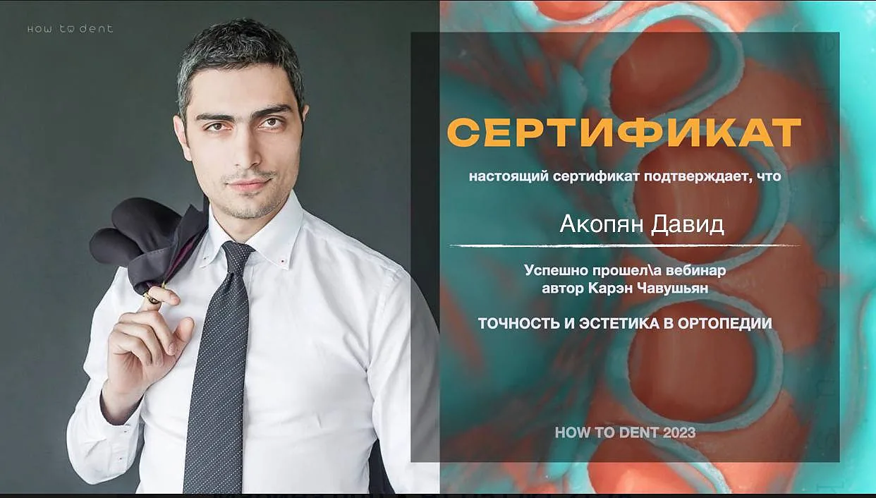 Акопян Давид Аршалусович постоянно совершенствует своё мастерство. Регулярно принимает участие в различных стоматологических конференциях, профессиональных симпозиумах и семинарах.