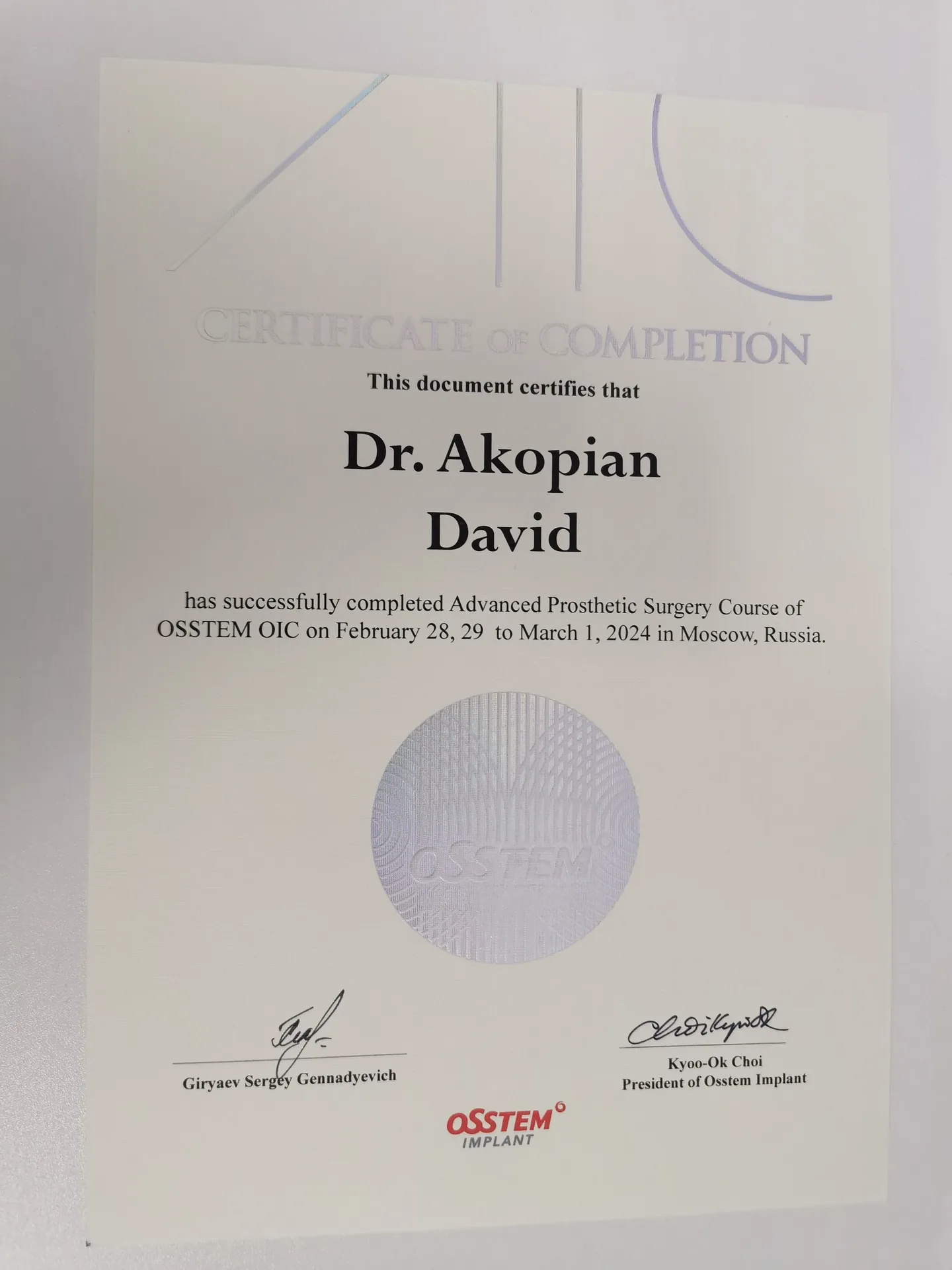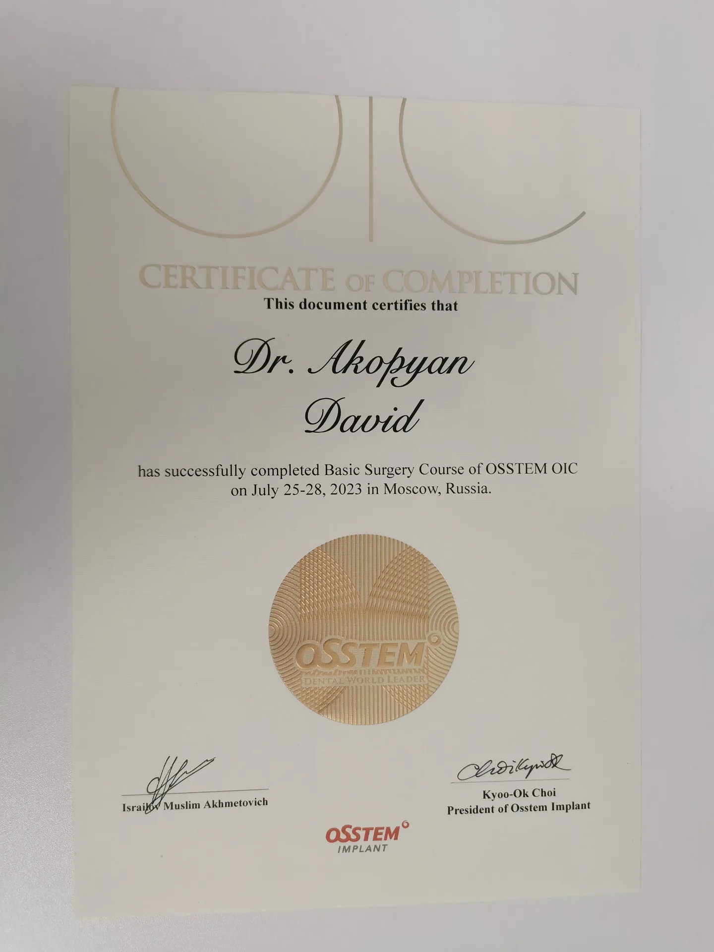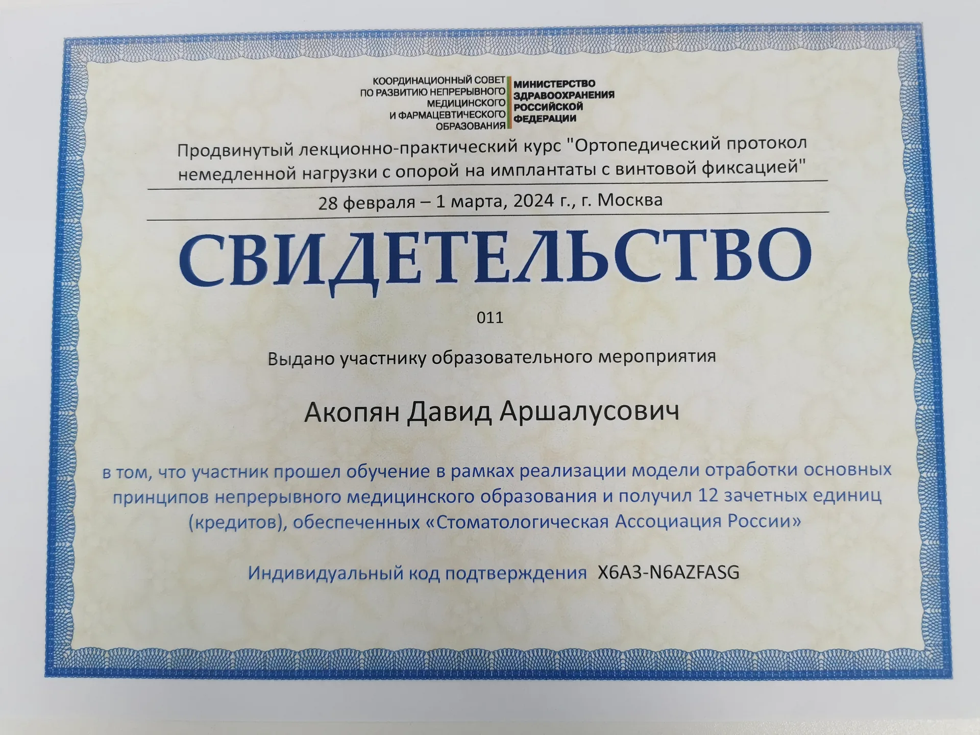 В 2024 г. был участником и закончил продвинутый лекционно-практический курс «Ортопедический протокол немедленной нагрузки с опорой на имплантаты с винтовой фиксацией». Получил Свидетельство об окончании курса.