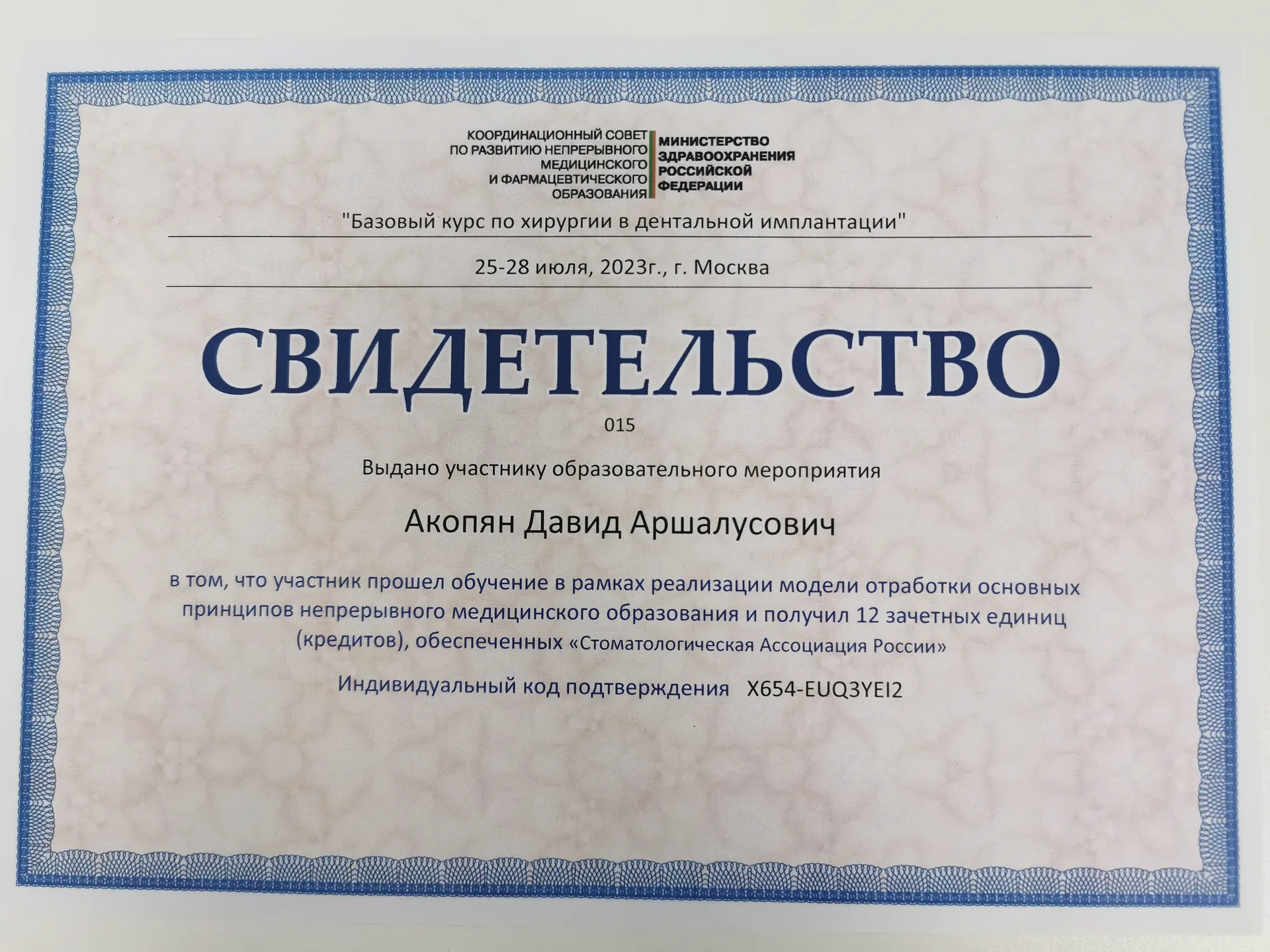 В 2023 г. прошёл обучение по теме «Базовый курс по хирургии в дентальной имплантации» и получил Свидетельство об окончании при Министерстве здравоохранения РФ по развитию непрерывного медицинского образования.