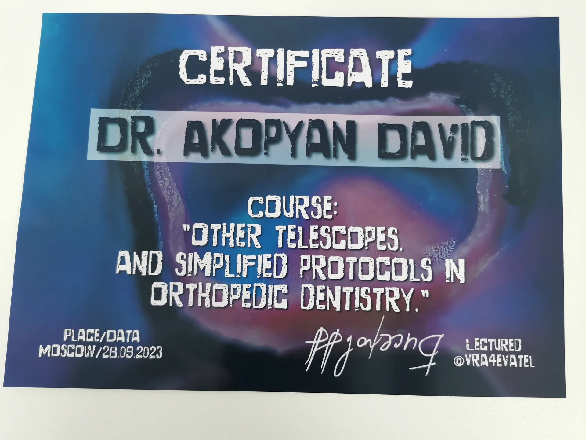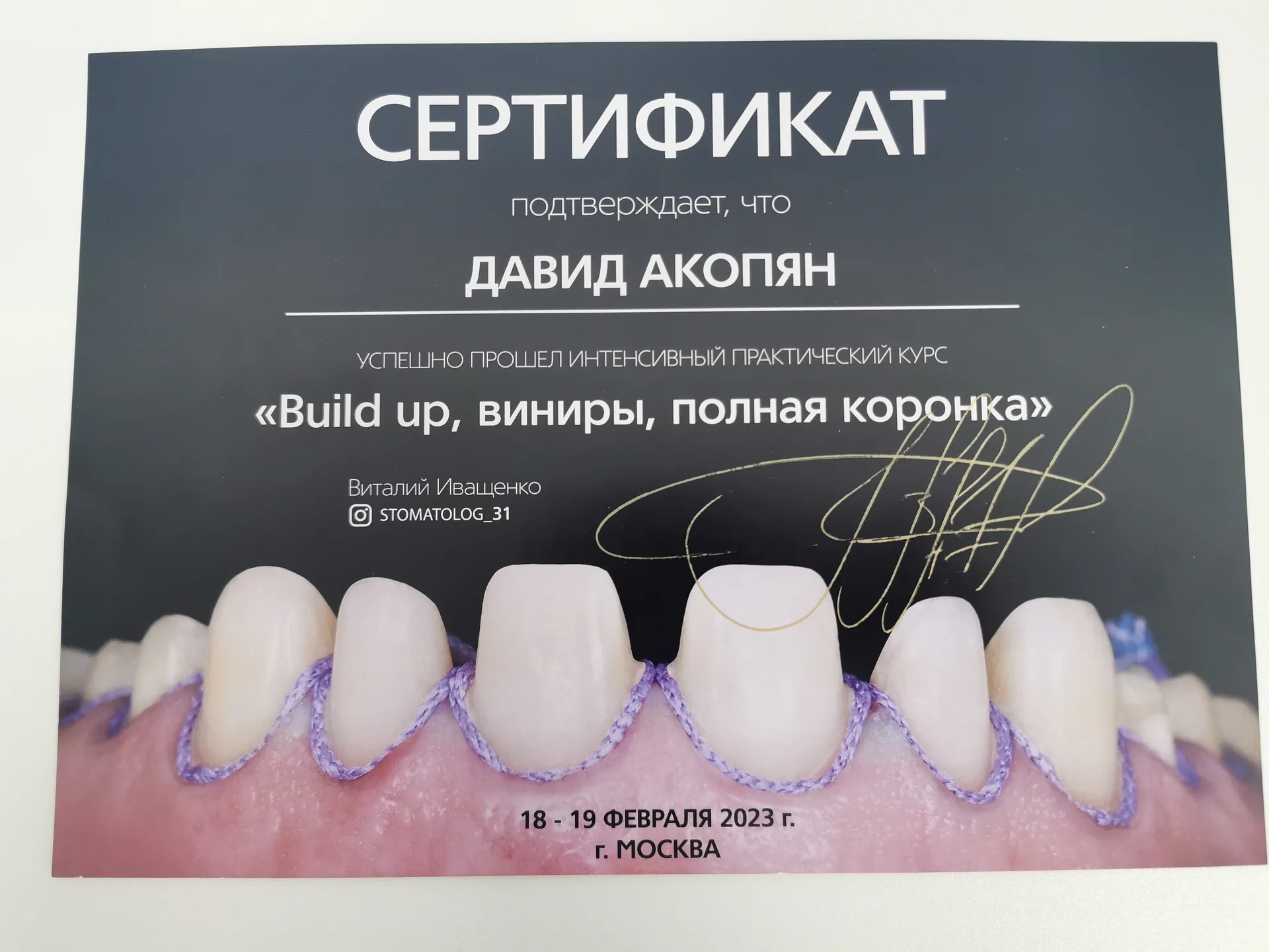 В 2023 г. успешно закончил практический курс «Build up, виниры, полная коронка» и получил сертификат.